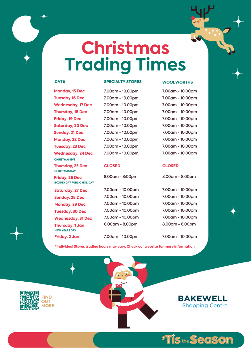 We’ve extended the trading hours at Bakewell Shopping Centre, just in time for the festive season to give you more time to conveniently pick up your fresh food, festive treats and gifts.